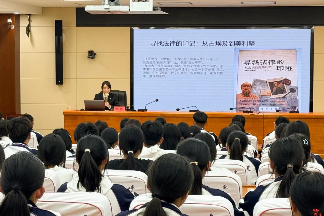 课堂活动过程 课堂开篇,法官没有直接讲法律相关内容,而是从“多读书”的话题切入:“书籍是打开世界的钥匙。无论你是想探寻法律的奥秘,还是想找寻人生的方向,读书都是最稳健扎实的第一步。”这番话让原本稍显紧张的同学们很快放松下来,也为这堂课埋下了“求知”的伏笔。 随后,法官结合自身的成长经历,将“法官梦”的种子悄然播撒进同学们的心田。她从年少时阅读法律书籍的心灵触动,讲到在法学院系统学习的求知历程,再到第一次穿上法袍、敲响法槌的庄严时刻。通过分享面对复杂案件时的潜心钻研、成功化解矛盾纠纷后的释然与欣慰等真实故事,她让同学们真切感受到了法官职业背后所承载的责任、坚守与荣光。许多同学听得专注入神,眼中渐渐闪烁出向往的光芒。 ★资深法官进校园讲堂★ 为了让“尊法守法”的理念更易理解,法官还溯源了法律文化:从刻在石柱上的《汉谟拉比法典》,到它如何奠定“以眼还眼、以牙还牙”的早期公平精神;从汉字“法”(灋)的由来——“氵”象征公平如水、“廌”代表明辨是非,到拆解法律“惩恶扬善、维护正义”的本质。她通过古今对照,让同学们明白尊法守法不仅是对规则的遵守,更是对文明与秩序的守护。 课堂结束后,原本准备离场的胡娇庭长被同学们簇拥而上。大家手持课本、笔记本,排起长队,纷纷请求法官签名留念,让这堂难忘的法治课在笔尖与笑容中定格。