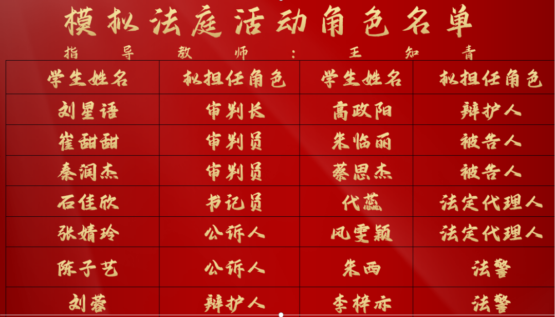 筹备阶段,宣威市人民法院法官全程提供专业指导,我校教师精心组织,高二年级学生踊跃参与,自主完成各项准备工作,具体角色安排如下:
