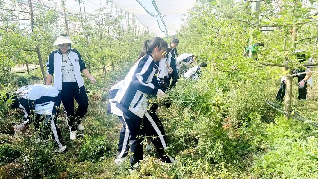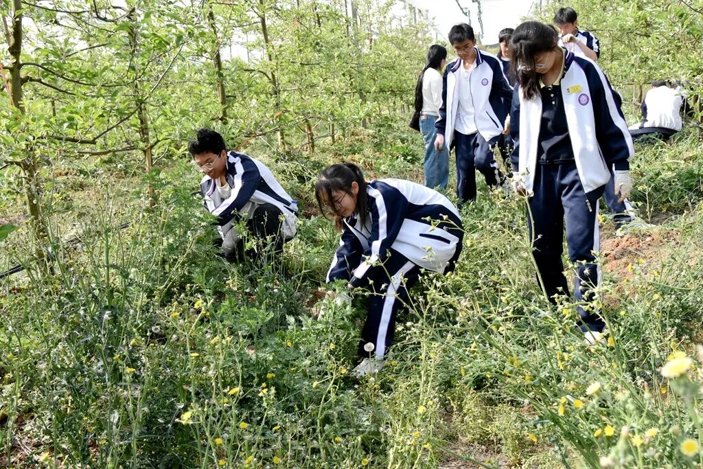 在基地技术人员和老师的指导下,同学们分组走进苹果园,拿起农具,清理果树下的杂草,在亲手劳作中,认真学习果树养护、除草护苗的基础农事技能,在团队协作中凝聚力量、收获成长。